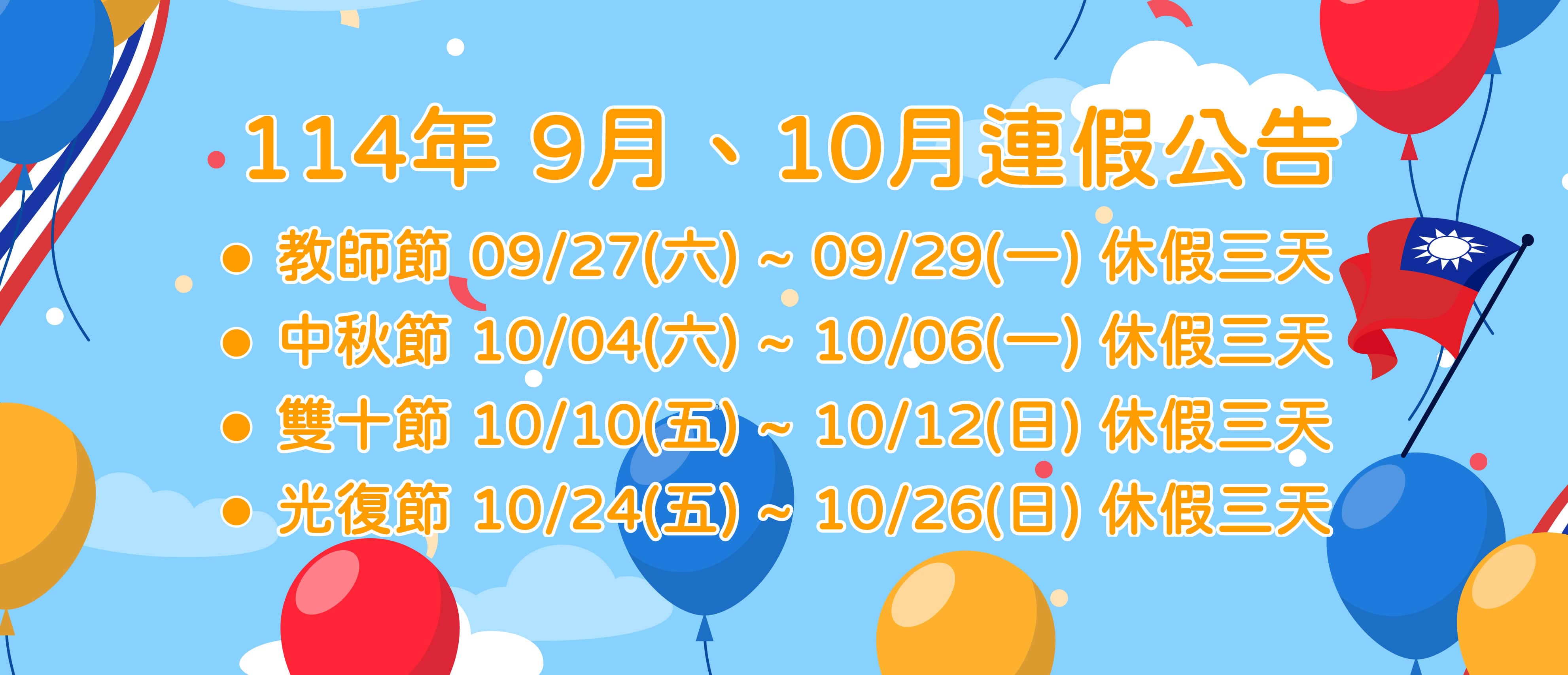 ◆ 雙十節 10/10(五) ~ 10/12(日) 休假三天