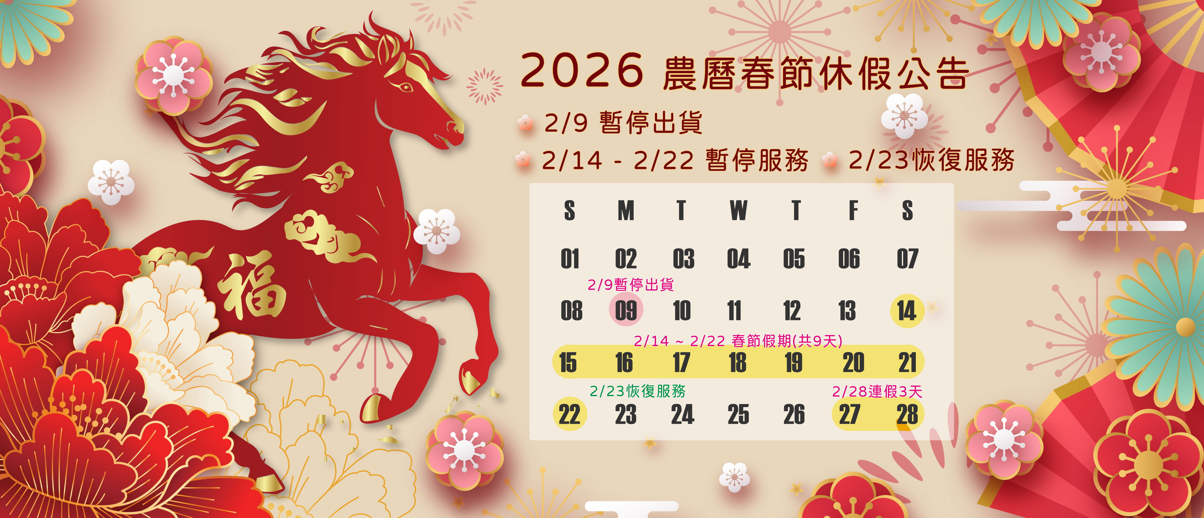 ◆ 2/14(六) ~ 2/22(日) 農曆春節期間(共9天),暫停服務。
